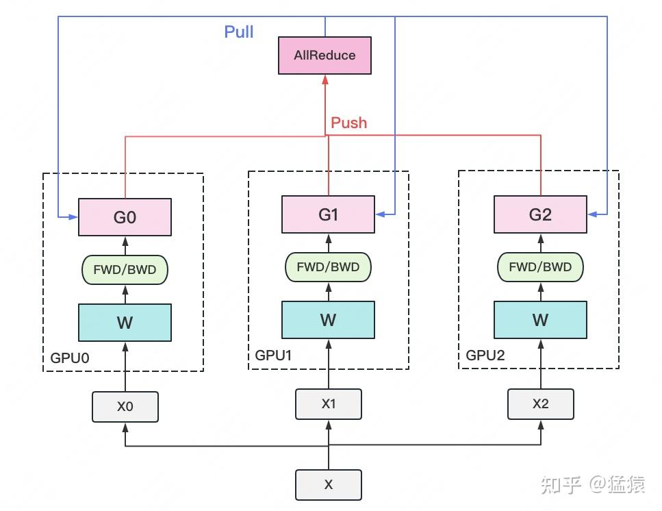 2.把一份数据X(例如一个batch)均匀分给不同的计算GPU。