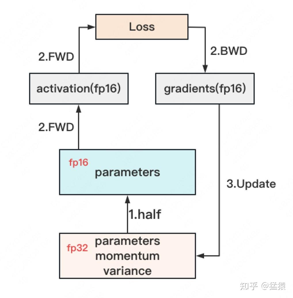 - 在forward开始之前,额外开辟一块存储空间,将fp32 parameter减半到fp16 parameter。