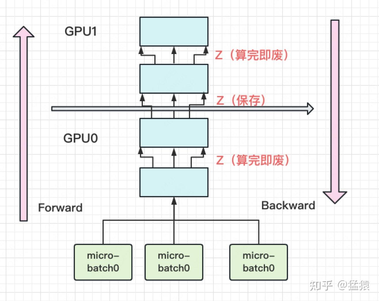 当你有一个单卡装不下的大模型时,把模型分割成不同的层,每一层都放指定的GPU上. 此时,模型做一轮forward和backward的过程如下: